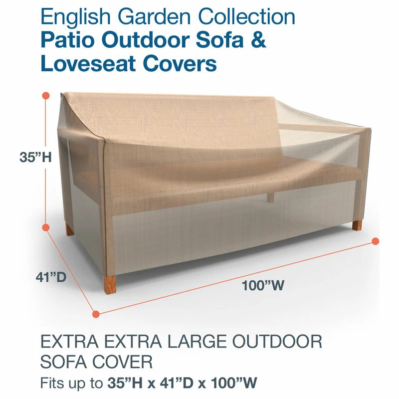 The Budge English Garden Outdoor Patio Sofa Cover, Extra Extra Large provides high quality protection to your outdoor patio sofa, loveseat or bench. Peaceful tranquility meets heavy-duty protection with Budge’s English Garden Collection. This collection features a rustic woven tan pattern that is accentuated by a dark gray piping, which lines the outer seams of the covers. Impeccably stylish, the English Garden Collection will compliment any outdoor garden or patio setting, all while keeping your furniture protected, rain or shine. This outdoor sofa cover material is made from heavy-duty 600 denier polyester material that, through Budge’s own extensive research and testing, is proven to provide 100% waterproof protection to your outdoor patio furniture. This material will defend against fading, rain, sun, dust, bird droppings, tree sap and more. Four sewn-in straps are included to help better secure the cover to your furniture in windy conditions. The seams are ultra-sonically welded together to enhance both the protective properties and longevity of the covers. Vents are strategically placed throughout the covers to ensure adequate air flow to release any trapped condensation that may cause mold from growing under the cover. This patio sofa cover measures 35″ H x 100″ W x 41″ D.