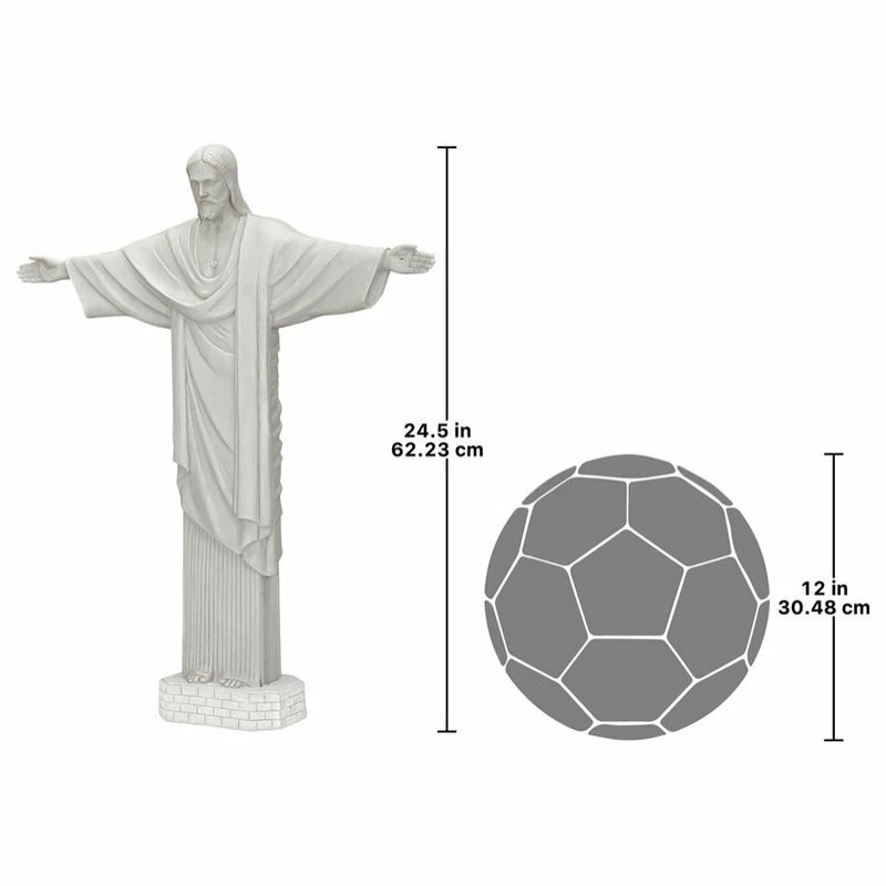 One of the New 7 Wonders of the World, this cultural icon replicates the famous sculpture of Christ dedicated on October 12, 1931 that overlooks the city of Rio de Janeiro, Brazil from high atop Corcovado Mountain. Devoted followers of Jesus will recognize the symbolic sacred heart and the outstretched arms of Christ. Sculpted with devotional detail, this spiritual sculpture is cast in quality designer resin with an antique stone finish. Whether in home or garden, this scaled replica will reflect both its history and your devotion. 20″Wx4Β½”Dx24Β½”H. 7 lbs.