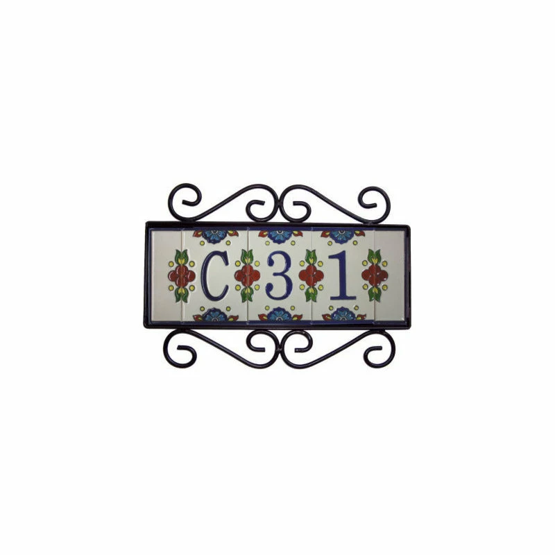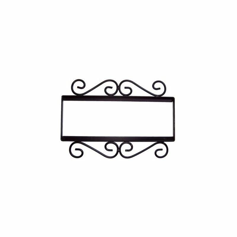 A wrought iron frame made by Mexican craftsmen. It will hold four Mission tile numbers or three number tiles and two endings. This is a simple handmade artistic frame, but carefully designed to enhance your house tile numbers. It was designed to be hung horizontally. Internal dimensions (where the actual tiles sit) are: 16 1/2 wide by 6 1/4″ tall.The house numbers frame has wrought-iron-made decorations in the upper and lower parts of the rectangle, they are about 2.2″ tall, which adds to the overal frame vertical size (width).House Numbers Frames Installation SuggestionsHorizontal installation: If you want to install your house tile numbers frame horizontally you can use one or two nails. In using one, the frame might not balance horizontally very well, to achieve a better result use two nails, one on each one of the decorations to hold the frame.”