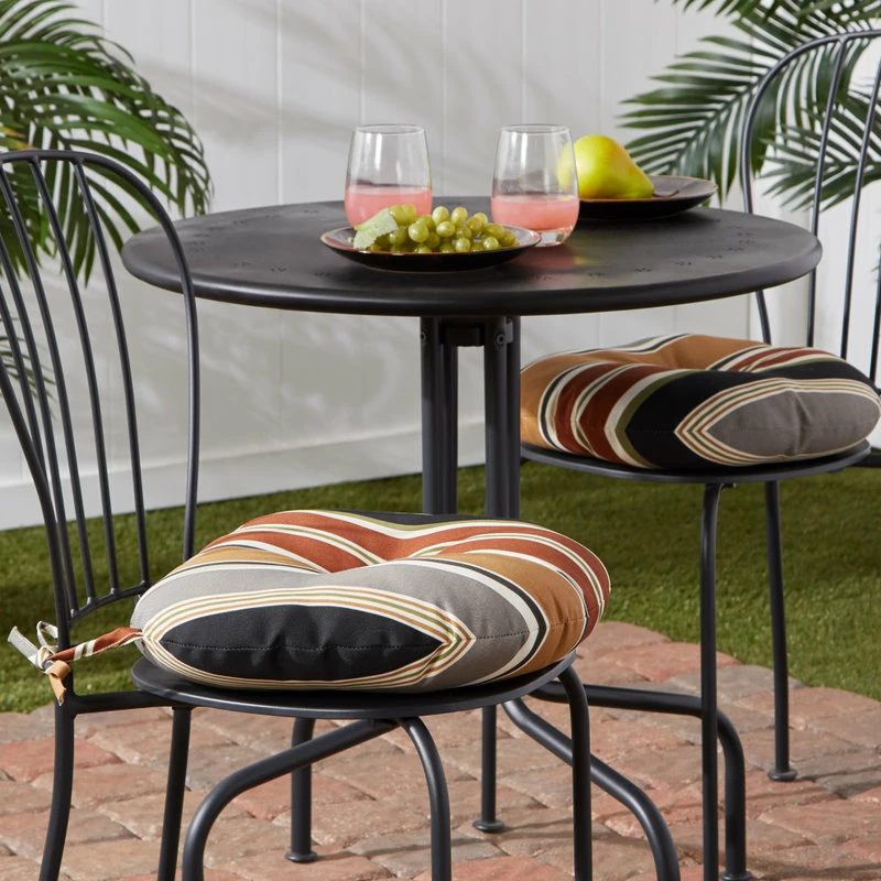 Add a bit of comfort and style to your outdoor bistro set with these Bistro Cushions from Greendale Home Fashions. Cushions feature a center circle tack which prevents filling from bunching and shifting, and two string ties to keep cushions firmly secured to chairs. Each set includes two 15 inch round chair cushions made from a 100% polyester, UV coated material that is fade, stain and water resistant. The cushion’s soft poly fiber fill is made from 100% recycled, post-consumer plastic bottles, and overstuffed for added comfort, strength and durability. A variety of colors and prints are available to enhance your outdoor decor.