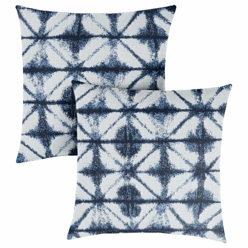 The white background of this Sunbrella Midori Indigo fabric beautifully contrasts the blue geometric design. Accentuate the look and feel of any seating area with the lovely addition of this set of two outdoor square pillows. Using distinct geometric patterns, the pillows in this set will offer a bold personality to stand out in any setting. Filled with 100 percent recycled fiber and sewn closed, these pillows will support and enhance any sitting experience through long periods of time. The exteriors of these pillows resist UV and fade damage, as well as mildew growth from exposure to water outdoors.