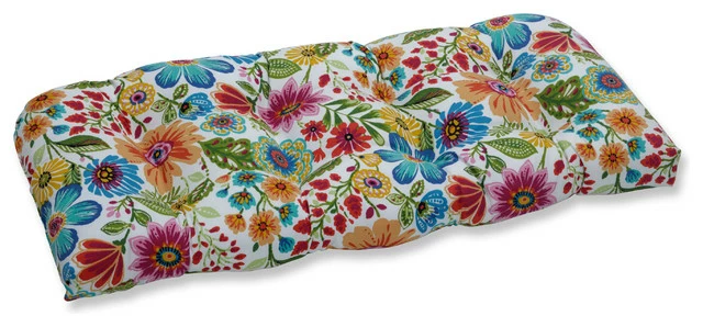 This bright, bold updated flower garden print on our tufted wicker loveseat cushion will bring a fresh new look to your outdoor patio decor. Inspired by a painterly Scandinavian print the delightful flora dances across the fabric in bright shades of pink, orange, turquoise, yellow and green. Additional features of this outdoor tufted wicker loveseat cushion include recycled polyester fiber fill with a sewn seam closure.