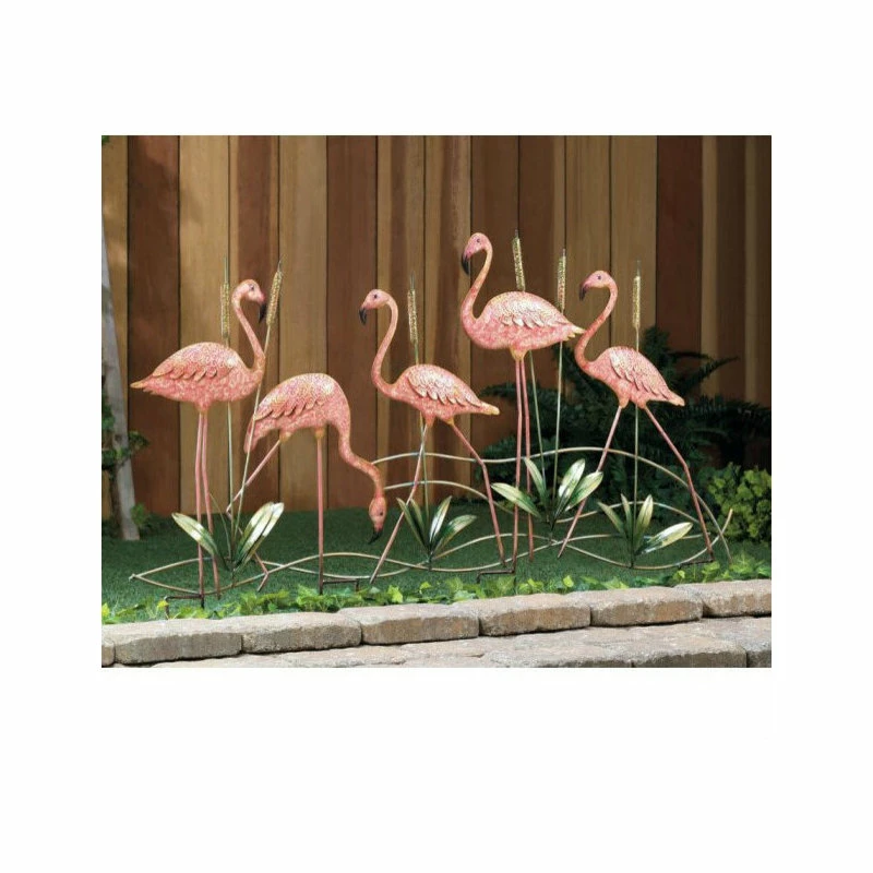 This fun metal garden sculpture will bright up any outdoor living space with a flock of flamingos! It stakes right into the ground and features cattails and five pink flamingos captured mid-strut