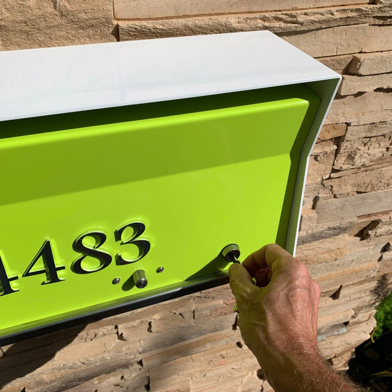 - The RetroBox Wall Mounted Mailbox in Arctic White is available in 12 different door finishes, can be ordered with stainless steel numbers in your choice of number styles, (Retro or Uptown), WE WILL CONTACT YOU FOR THE STYLE ADDRESS NUMBERS ON THE BOX,