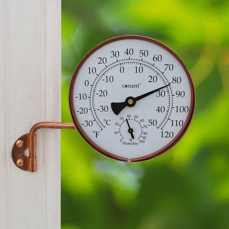 This handsome Copper Weather Station has a thermometer that measures temperature on both Fahrenheit and Celsius scales in an easy-to-read format. This useful copper weather station also has a hygrometer on the lower half of the dial which indicates percent of relative humidity. 3.5 inch long swivel arm and mounting bracket are included with the copper weather station for simple installation. The swivel arm of the copper weather station allows for convenient placement and viewing. The copper weather station is crafted of solid copper with a living finish (over time this product will age gracefully into a nice patina and eventually, a stunning verdigris.) With a German engineered mechanism, the copper weather station has quality construction that is guaranteed for life.