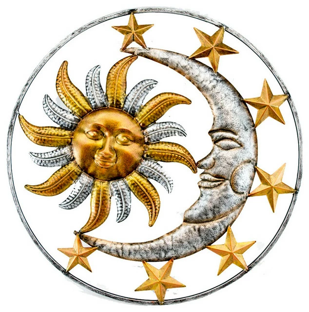 A celestial sun, quarter moon and dimensional stars hang in harmonious balance to make your walls shine! Whether displayed indoors or hung on an exterior wall, this metal art sculpture is sure to brighten your space. Dancing rays give the sun a sense of motion while the moon and stars bring a sense of calm to the piece, and a decorative frame completes the look of the piece. Display it on a focal wall anywhere indoors or let it greet your guests outside near the front entry. Hang it by the pool, on the patio or on a fence to bring a little life to your yard or garden. This 17 inch diameter wall sculpture brings personality, character and artful inspiration to your home.