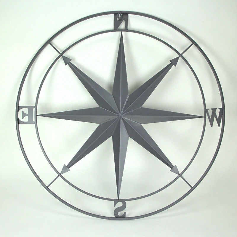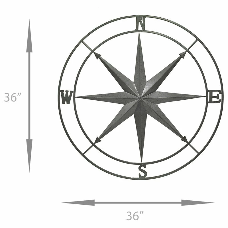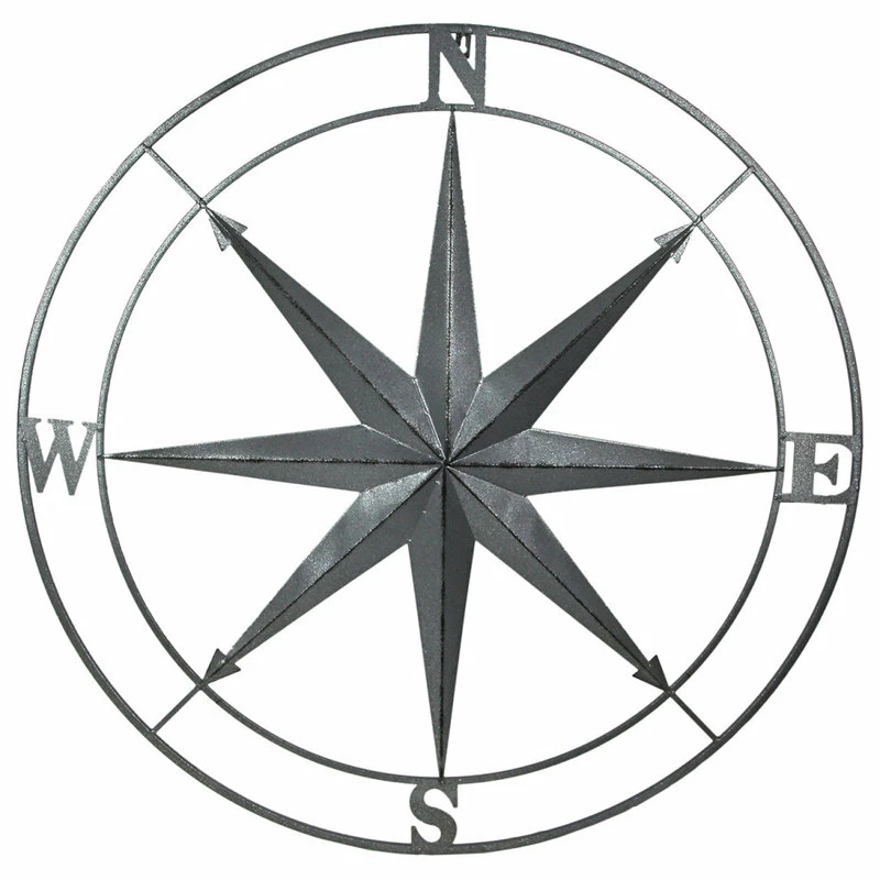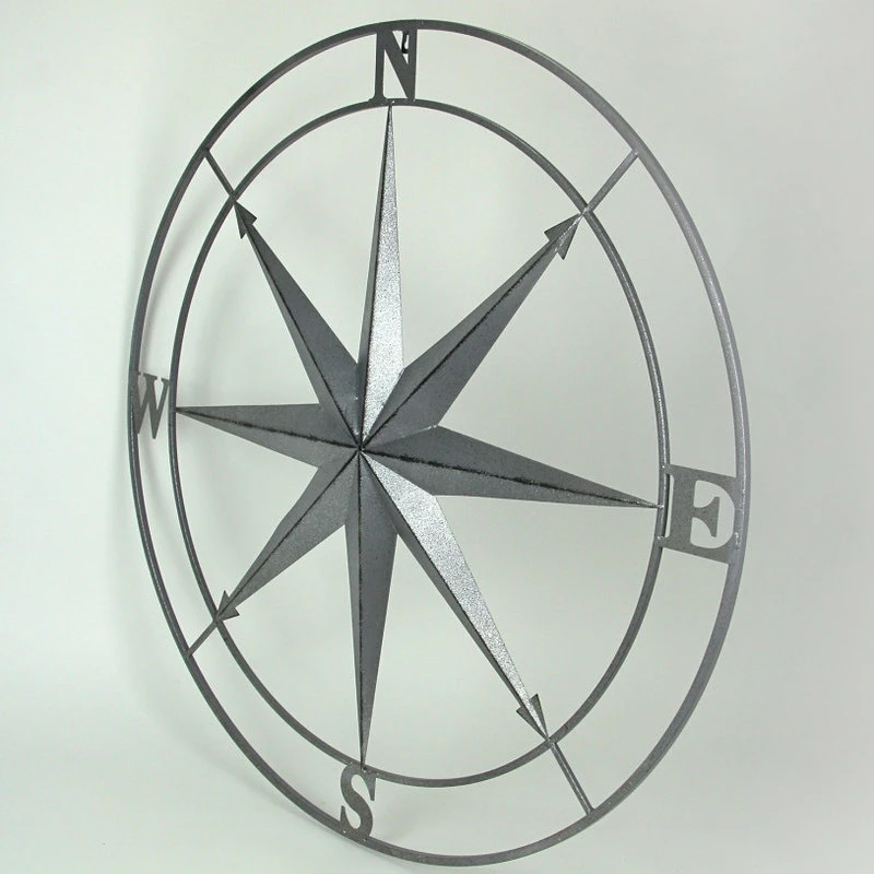 You can give your decor a new design direction with this large compass rose sculpture hanging on the wall! The large 36-inch diameter size will stand out with nautical, beach, or coastal design elements whether on a wall indoors, on the patio, or out by the pool. The metallic silver finish looks vintage with black speckles decorating it all over. The original compass rose points to the 8 named winds that previously guided sailing ships at sea. Though it won’t actually tell you which way the wind is blowing, it’s sure to navigate some interest your way hanging on a garden fence, barn wall, or porch wall near the front entry, and if you don’t want it to hang on the wall, let it lean against it on a wall shelf or side table, or you can use it in your yard landscape.